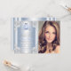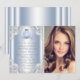 Hermosas invitaciones de princesa Cenicienta Quinceañera con hermoso carruaje de princesa azul y plateado sobre un hermoso fondo azul y plateado con espirales de Cenicienta. Esta elegante invitación de cumpleaños de Cenicienta se personaliza fácilmente para su evento simplemente agregando su foto y detalles en el estilo de fuente y redacción de su elección. Este es un diseño impreso sin diamantes reales, brillo, joyas, láminas, etc.