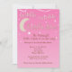 La invitación linda de la fiesta de bienvenida al bebé con un centelleo, centellea poco tema de la estrella. Cielo rosado suave con estrellas juguetonas del blanco y una luna creciente poner crema suave. La cinta blanca Twisty adorna el top. Fácil corregir para su propio centelleo del centelleo poco tema de la estrella.