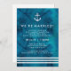 Estas invitaciones de fiesta después de la boda de moda presentan un fondo con aspecto de acuarela azul, con rayas blancas y un ancla náutica.