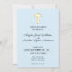 Una invitación simple y moderna a una ceremonia boda basada en las tradiciones cristianas. El diseño tiene una cruz de oro simulada sobre un modesto fondo azul claro. El diseño, limpio y abierto, ofrece una elegancia sobria a esta invitación. Como la cruz simboliza la fe de las parejas con dios.