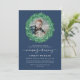 Invitación a una ceremonia de nombres con la foto de su bebé dentro de una corona de berry azul verde y pálido. Fuentes elegantes con ceremonia de nombres escrito en un guión fino y encantador. La parte trasera está decorada con un estilo de vegetación.