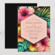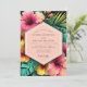 Immerse your special day in a vibrant, tropical paradise. This bold design features brilliant cerise and yellow hibiscus blossoms bursting forth from a dark, moody background. Lush monstera and palm leaves in shades of teal and emerald green complete this exotic and dramatic botanical arrangement.