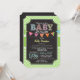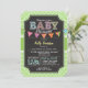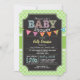 Invitación neutra a la ducha de bebé con tipografía tipográfica tipográfica tipográfica con un patrón de quatrefoil verde brillante. Los tipos de letra de tiza de estilo vintage se encuentran en un fondo fresco de pizarra, con banderas coloridas rosadas, naranjas, violetas y polka.