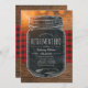 Invitaciones a Chalkboard Mason Jar, Fiesta Rústico de Jubilación BBQ. Cuenta con un creativo ilustracion con tarro de albañilería en un fondo de madera y manteles. Una hermosa tipografía de texto - se puede editar. Perfecto para fiestas de retiro rústicos! Diseñado por http://superdazzle.com