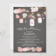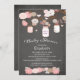 Invitación moderna y de moda a la ducha con jarra de albañil, con una rama de árbol con bonitos de flores rosadas florales y populares tarros rústicos colgantes con "es un chica" en uno. Perfecta invitación contemporánea a la ducha con jarra de albañil para una ducha de bebé, ducha de bebé o ducha de bebé neutra. Visita nuestra tienda para ver nuestra hermosa selección de invitaciones a jarros de albañil.