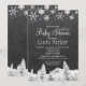 Moda de invierno rústica estilo campestre bebé ducha de invierno elegante plantilla de invitación con bordes de copos de nieve blancos, caída de la nieve y pinos maravillosos paisaje de tierra sobre fondo de carbón de carbón gris oscuro. Rellene su información en los puntos, Puede elegir personalizar de los tipos de letra y los colores de las letras. — La invitación es apta para elegantes fiestas rústicos de invierno y Navidades de duchas. — Si necesita ayuda, por favor contáctame.