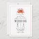 Invitación a la boda con un diseño de color color chambray inspirado en las acuarelas. El frente presenta el ilustracion de un cangrejo y el borde rojo de una piinstrita descolorida. Personalice el texto gris.