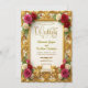 Set the tone for a formal evening union with this ornate design, featuring vintage botanical art and a printed gold foil effect for sophisticated elegance.This design features a symmetrical composition anchored by a printed faux gold embossed frame with intricate scrolling filigree, evoking a classic Baroque aesthetic. The artwork displays realistic botanical illustrations of blush pink and deep red roses with muted green foliage, surrounding a central soft ivory panel. Two small cherub angels hold a delicate ribbon banner at the crest, adding a touch of Victorian romance. The text is presented in an elegant flowing calligraphy script paired with traditional serif typography.This is a flat printed image with a faux foil and texture effect; it does not contain actual raised metal or embossed paper.