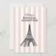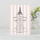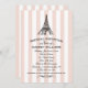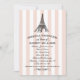 Moda vintage París invitaciones a una ducha de boda con decoración de con decoración de , incluyen un ilustracion negro de la icónica Torre Eiffel, rayas de champán/cameo rosa y blanco, y un elegante texto de escritura personalizado que puede ser personalizado para que la novia sea y su evento parisino magnifique.