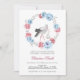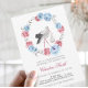 Invitación de champán de bebé floral rosa y azul de invierno. La cigüeña está rodeada de una corona de peonías de acuarela. Artículos coincidentes disponibles.