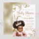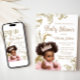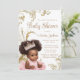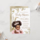 Invitación de baby shower de princesa negra con una adorable bebé vestida con un precioso tutú rosa y una tiara de joyas sobre un hermoso fondo dorado con espirales. Esta invitación de baby shower de princesa africana se personaliza fácilmente con los detalles de su evento. También puede cambiar el fondo y el color del texto.