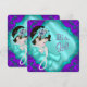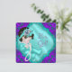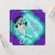 Invitación de baby shower de azul cian y púrpura con elegante fondo de remolino azul cian y púrpura y adorable bebé vestida con un collar de perlas y flores moradas en el pelo. Esta invitación de baby shower azul cian y púrpura se personaliza fácilmente para su evento simplemente agregando sus datos en el estilo de letra, color y redacción de su elección.