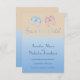 Un anuncio divertido y moderno de boda para salvar la fecha con un ambiente relajado de resort de playa. La arena simulada y el oleaje proporcionan el fondo para hermosas chanclas azules y rosadas en la parte superior de la tarjeta.
