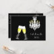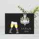 Elegante invitación de fiesta de Año Nuevo hecha en negro azabache, con hermosos gráficos de una silueta de araña blanca, con velas brillantes. Dos vasos decorativos de champán en el lado izquierdo de la invitación y el texto blanco personalizado dice Let's Ring In 2015. El reverso de la invitación también se realiza en negro, con la misma versión más pequeña de la lámpara de araña, en la esquina superior derecha. El texto blanco es totalmente personalizable para satisfacer las necesidades de su fiesta. Hermosa manera de sonar en el nuevo año.