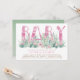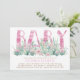 Invitaciones de cumpleaños de bebé cactus con hermosas letras de acuarela y cactus y flores con fondo de acuarela. Esta linda invitación de cumpleaños de bebé cactus se personaliza fácilmente para su evento simplemente agregando sus detalles en el estilo de letra y color, y redacción de su elección.