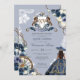 Diseño rústico elegante con un tema de charro/vaquero/rancho. Con un hermoso escudo, florales azules y blancas de lujo y botas de vaquero/vaquero de bonito