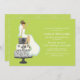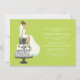 Las invitaciones divertidas y de moda incluyen un hermoso ilustracion de una novia feliz sentada encima de un pastel de boda. Diseño perfecto para duchas de novias, fiestas de soltera, etc.