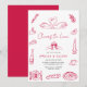 The “Cheers to Love” Hand Drawn Retro Couple Shower Invitation features a playful Italian-inspired theme with a clean and modern layout. The design highlights charming red line art illustrations arranged around the border. These include swans, clinking wine glasses, a wine bottle, pizza, bread, cheese, citrus slices, olives, a candle, a coffee cup, and a dinner plate setting. The simple hand-drawn style gives the invitation a relaxed and welcoming feel, perfect for a co-ed celebration.