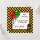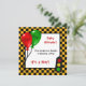 ¡Es un niño! Guay y los chicos de moda invitaciones a la ducha de bebé con un brillante borde negro y amarillo de coches de carrera a cuadros y adornado con divertidos globos rojos y verdes y un colorido semáforo con una luz roja para parar, y luz verde para ir. Personalice estas carreras con la adición del nombre de la familia, o de la madre.