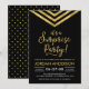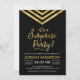 Invitación moderna de "Es una Fiesta Sorpresa" con un elegante chevron geométrico y la palabra "es una Fiesta Sorpresa" en falso oro sobre un fondo negro. Son perfectas para fiestas sorpresa de cumpleaños para celebrar cualquier edad. La tarjeta incluye un reverso con un patrón coincidente. Echa un vistazo a los artículos coincidentes aquí http://www.zazzle.com/collections/modern_faux_gold_chevron_celebration_collection-119531050277382712?rf=238364477188679314