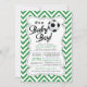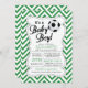 Moderna, audaz y brillante invitación a la ducha de bebé deportiva con una linda pelota de fútbol. Nuestro programa It's a baby boy es una invitación al fútbol se coloca sobre un lindo fondo de rayas de zigzag verde y blanco chevron y tiene una contraposición para un toque especial. Perfecto para una pequeña ducha de bebé para niños con estrellas