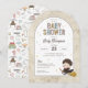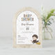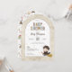 Celebra a tu pequeño mago en camino con esta encantadora invitación para baby shower de Harry Potter que presenta al propio Harry. Este diseño encantador incluye una adorable ilustración de Harry Potter con sus túnicas de Hogwarts, montado en su escoba y listo para aventuras mágicas. El fondo está salpicado de estrellas coloridas para dar un toque de fantasía. Las fuentes elegantes y juguetonas muestran hermosamente tus detalles personalizados, incluyendo el nombre del homenajeado, fecha, hora, ubicación, información de RSVP y registro de regalos. La forma arqueada única de la invitación crea un ambiente de libro de cuentos, mientras que la parte posterior muestra un divertido patrón de iconos del mundo mágico como libros de hechizos, pociones, calderos y criaturas mágicas. Perfecta para cualquier fanático de Harry Potter, esta invitación trae un toque hechizante a tu baby shower.
