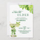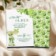 Un diseño moderno y elegante que presenta una ilustración de acuarela de un martini de lima con aceitunas verdes, atado con un lazo verde y un patrón de lima lindo en la parte posterior. Personalice los detalles para una Celebración de Cumpleaños única y chic.