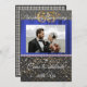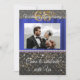 Invitación Chic negra y dorada con seda azul que introduce la fotografía de la pareja.