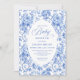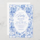 Create a timeless first impression with this baby shower invitation featuring elegant French toile de jouy roses in refined shades of navy blue, royal blue, dusty blue, and deep blue, inspired by classic chinoiserie floral design. This sophisticated style blends heritage elegance with modern charm, making it perfect for a memorable baby shower celebration.