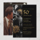 Esta elegante invitación de aniversario de bodas de oro floral negra y dorada se puede personalizar con su información en tipografía moderna y una foto especial en el reverso. Diseñado por Thisisnotme©