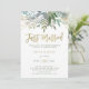 Estas elegantes invitaciones minimalistas para un brunch después de la boda presentan un trendy follaje de acuarela y hojas botánicas sobre un fondo blanco limpio con una moderna tipografía manuscrita en falso dorado que dice "recién casados".
