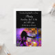 Invitación a una fiesta con una chica bailando y notas musicales moradas en la parte inferior en el medio y un fondo negro con un espacio para poner todo el texto de la invitación.