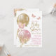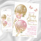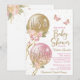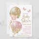 Invitación a baby shower con globos rosados y dorados con flores, mariposas y lazos sobre un fondo blanco. Esta linda invitación de baby shower rosa y dorada se personaliza fácilmente con los detalles de su evento. También puede cambiar el color de fondo en esta adorable invitación de baby shower rosa y dorada.