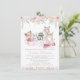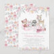 Invitación de baby shower de niña con animales del bosque en un fondo floral de acuarela pastel rosa y dorado. Esta linda invitación de baby shower de niña es fácilmente personalizable para su evento simplemente agregando sus detalles. También puede agregar un color de fondo al frente y atrás.