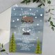Una invitación a la ducha de bebé con el ilustracion de un oso bebé colgado en una rama de árbol rodeada de estrellas. Ilustracion de montaña y árboles en el fondo. Personalice el texto. El fondo está inspirado en las acuarelas de color azul oscuro. El oso lleva una corona de flores.
