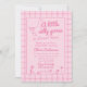 Si buscas una elegante invitación única y fácil personalizable para una ducha de bebé, esto es perfecto para ti. Como ven, presenta un guión retro escrito a mano de una pequeña gallina tonta que está casi ahí en rosa vívido. Y ganso dibujado a mano. Y marco de borde rosa y cuadrados de cuadros rosados. Todo en un fondo rosa pálido. Muy fácil de personalizar y uso. Así que agarrarlo y hacer que sus invitaciones estén muy comprometidas.