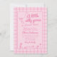 Si buscas una elegante invitación única y fácil personalizable para una ducha de bebé, esto es perfecto para ti. Como ven, presenta un guión retro escrito a mano de una pequeña gallina tonta que está casi ahí en rosa vívido. Y ganso dibujado a mano. Y marco de borde rosa y cuadrados de cuadros rosados. Todo en un fondo rosa pálido. Muy fácil de personalizar y uso. Así que agarrarlo y hacer que sus invitaciones estén muy comprometidas.