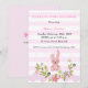 Una invitación a la ducha de bebé editable en crema rosa, diseño con conejito, flores, rayas blancas y rosas y globos.
