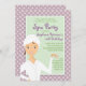 Una chica de ojos marrones bonito está tomando una manicura mientras se sumerge en su mullida bata blanca para un día de mimar en el spa. ¡Una gran idea de fiesta de cumpleaños para los adolescentes, los 'tweens y los graduados! En suave lila morada y verde menta con puntos de polka.