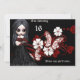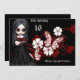 Una muñeca gótica bonito frente a hermosas mariposas y flores rojas y blancas, todo con un fondo negro puro. Estas invitaciones serían perfectas para un dulce de 16 años y son totalmente personalizables para agregar su información en la parte posterior. También puede cambiar el número de cumpleaños rellenando las plantillas de texto proporcionadas.Todos los elementos están impresos en nuestros productos de alta calidad, no incluyen ningún oro real, joyas, bordados u otros elementos textiles. Todos los diseños son derechos reservados de Tabitha Jones.