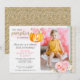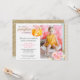 Flores femeninas y dulces acentúan una calabaza brillante de otoño especialmente para el cumpleaños de tu pequeña. Perfecto para celebraciones de octubre o noviembre, este diseño combina un estilo trendy de acuarela y estética cottage chic, con un toque de textura brillante dorada juguetona.