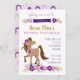 Invitación a una fiesta para un cumpleaños o celebración con tema de caballo o pony en morado y dorado. Contactar al vendedor para opciones de colores personalizados.