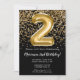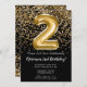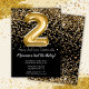 Elegante invitación de fiesta de 2do cumpleaños en negro y oro para un chica de 2 años con elegante escritura de escritura y divertidos globos de Relieve metalizado.