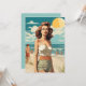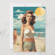 La imagen es una poster de estilo pop-art que representa una escena de playa veraniega de los años 50. Una mujer segura de sí misma con voluminosos cabellos ondulados, vestida con un elegante traje de baño blanco y naranja, se destaca en primer plano. Como telón de fondo, otros bañistas practican diferentes actividades a lo largo de la orilla, con un sol brillante en un cielo azul salpicado de nubes. La estética general combina la moda retro con un ambiente animado y nostálgico.