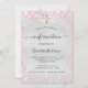 Una confirmación moderna y elegante, que celebra a un chica. Fondo de aspecto metálico de color plateado falso decorado con un polvo falso purpurina rosado y una cruz dorada. Personalice y agregue un nombre y detalles del fiesta. Letras de color negro.