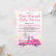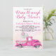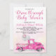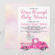 Invitación a la ducha de bebé drive through con camión rosa lindo, globos y pancarta en un fondo de acuarela rosa y dorado. Esta invitación a la ducha de bebé drive through se personaliza fácilmente para su evento simplemente agregando los detalles de su evento.