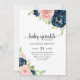 Chica floral rústica invitación a rociar bebés con flores de acuarela pintadas con elegancia en rosa y azul marino, junto con los detalles de tu evento en un formato moderno. Las rosas rosas rosas rosas rubias hacen de esta invitación una gran invitación para una celebración de primavera y los rosas azul marino la hacen genial para el otoño.