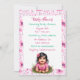 Curas invitaciones personalizadas a la ducha de bebé con una linda bebé de cabello oscuro con una flor rosa en el pelo, fondo floral rosa Bonito con texto rosa y verde. El bebé puede representar hindú, medio oriente, afroamericano, latino o hispano.