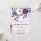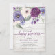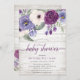 Esta rústica invitación a la ducha de bebé chica presenta un toque de elegancia con el moderno tipo de letra de caligrafía. Hermosas flores moradas y acuáticas de lavanda con vegetación de flores silvestres decoran el fondo del granero de madera.