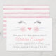 Invitación para una fiesta de baby shower de gatito con una adorable cara de gatito feliz en acuarela sobre un fondo de rayas rosadas y blancas. Estas invitaciones para una fiesta de baby shower de gato se personalizan fácilmente para su evento simplemente agregando sus datos.
